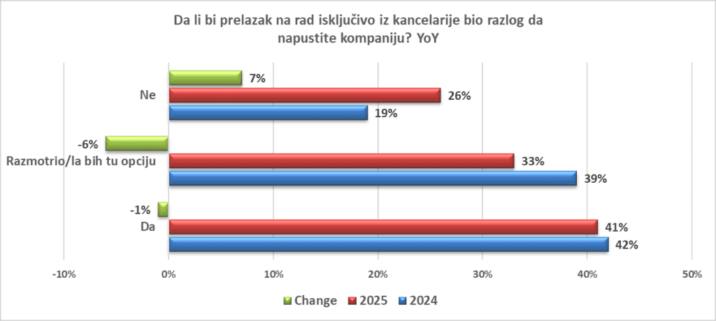 Na pitanje: “Da li bi prelazak na rad isključivo iz kancelarije bio razlog da napustite kompaniju?” — čak 41% ispitanika odgovorilo je da.